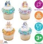 DecoPac Bluey So Much Fun Cupcake Rings, 24 Cupcake Rings featuring everyone’s favorite lovable, energetic, blue heeler puppies Bluey and Bingo together with Bandit and Chilli are ready for birthday celebrations. Bring Bluey to the dessert table with these cupcake rings and make your sweet treats extra special.