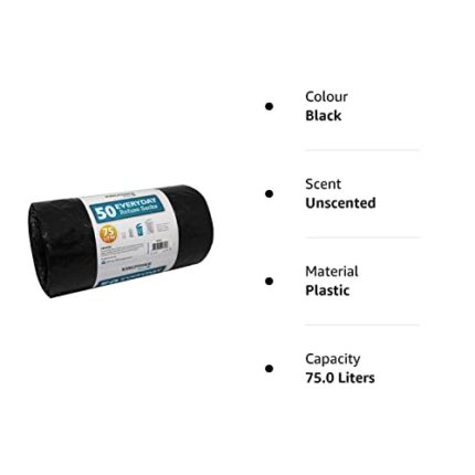 Brand: KingfisherColor: BlackFeatures:Everyday bin bags, 50 packIdeal for general household waste and use in warehousesCircumference of bag 74 cmHeight of bag 88